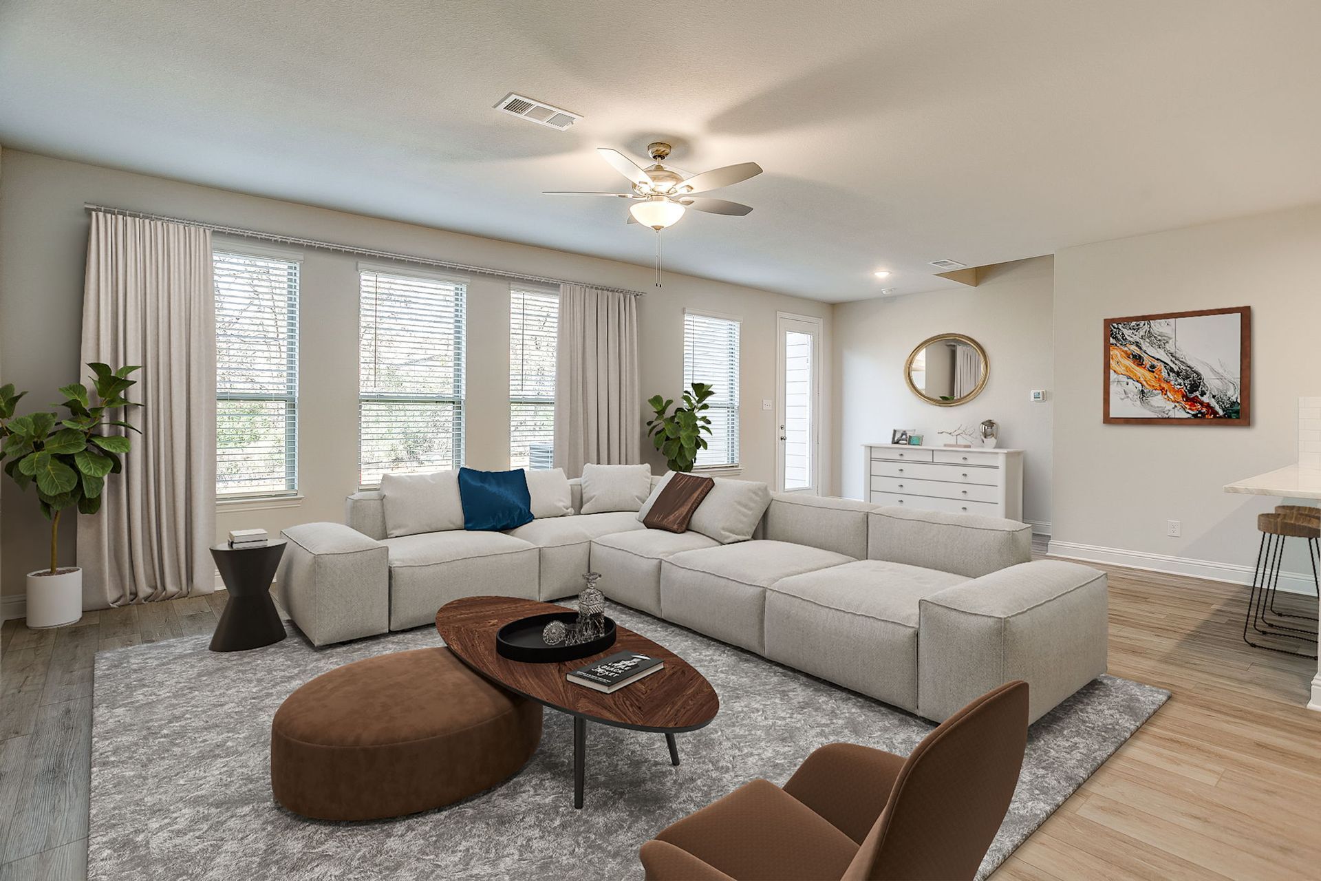 The living room offers plenty of space for relaxation and gatherings, while a conveniently located powder bath adds extra practicality.